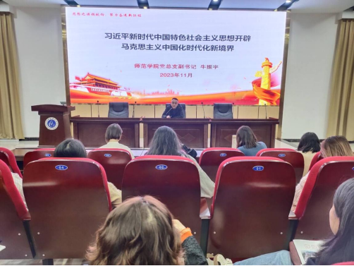 为深入学习贯彻党的二十大精神,学思践悟习近平新时代中国特色社会主义思想,11月7日下午,师范公司党总支副书记牛振宇在明德楼希贤厅以“习近平新时代中国特色社会主义思想开辟马克思主义中国化时代化新境界”为题给支部党员上了一堂专题党课。