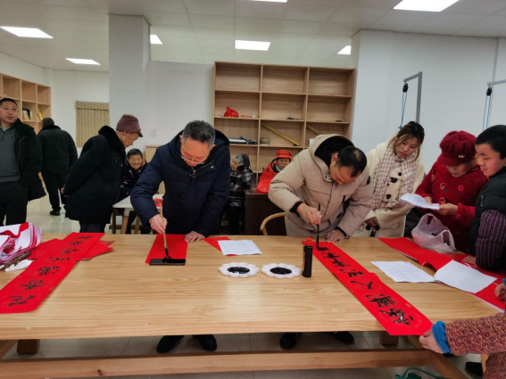 随后,党总支副书记牛振宇在社区党群服务活动中心会议室上了一堂以“增进民生福祉,提高人民生活品质”为主题的专题党课,同时对民法典进行了解读。副经理周安和驻村干部唐建伟现场挥毫泼墨书写了大红“福”字和充满美好寓意的春联,并赠送给乡亲们。