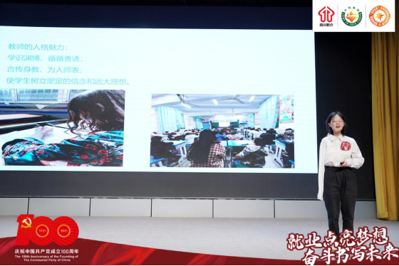 公司365best体育官网登录语文教育王彬同学台风稳健,讲述生动,乐观向上。她将立志成为一名人民教师,以身作榜样,去滋养更多青少年,从自我认知、职业认知、未来规划等方面做了详细讲解,获得众多企业举牌以及就业专家好评。