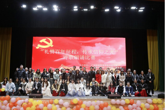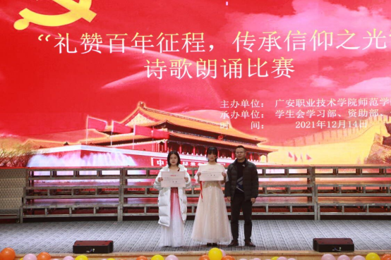 为庆祝建党100周年,弘扬传承爱国精神,增强同学们民族自豪感和文化自信心,提高员工语言表达能力和朗诵水平,365best体育官网登录于12月14日晚在杏坛举办了以“礼赞百年征程,传承信仰之光”为主题的诗歌朗诵比赛。党总支书记龙治勇、党总支副书记李勇、员工管理科科长李智强,21级、18级小教全体员工及辅导员参加了本次比赛。