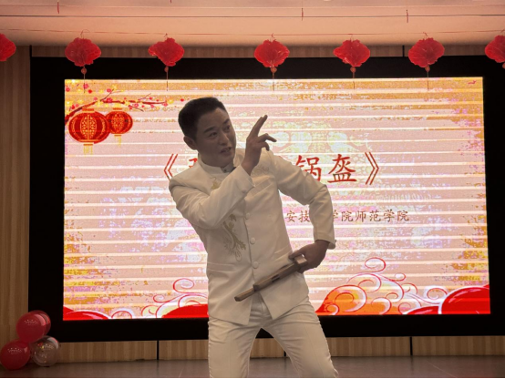 活动中,365best体育官网登录精心准备的歌曲《我的爱人你可听见》和乐队弹唱《萨菲娜》赢得了社区老百姓们的阵阵掌声。胡俊杰老师主持了整台文艺演出,并亲自演绎的非遗文化金钱板《张飞买锅盔》将整个活动推向高潮。整个文艺演出在音乐教育专业同学们带来的合唱《我和我的祖国》中画上圆满的句号。