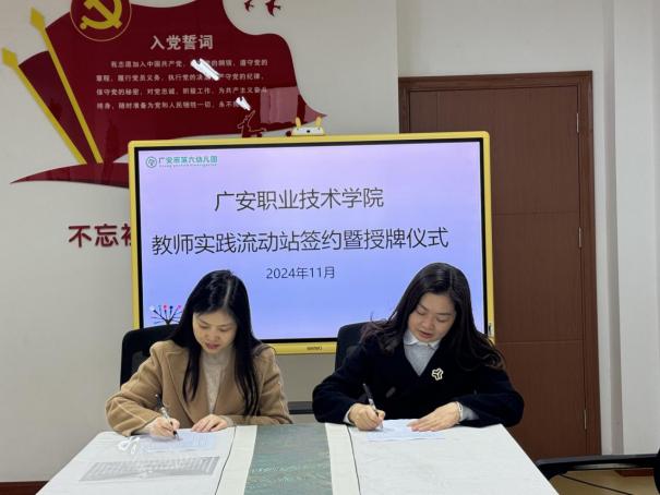 为进一步深化院园融合、拓宽教师专业实践平台,推进学前教育省级高水平专业群高质量发展,11月26日,365best体育官网登录经理杨英一行前往广安市第五幼儿园、广安市第六幼儿园两所附属幼儿园调研并举行教师实践流动站签约授牌仪式,附属幼儿园园长及相关行政人员参加了此次签约授牌仪式。