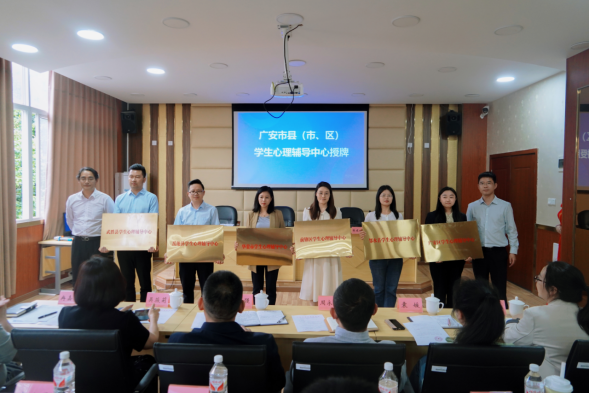 仪式现场,市教体局宣读了《关于成立四川员工心理健康教育研究中心(广安分中心)的通知》,与会领导共同为分中心揭牌,并向6个县(市、区)心理健康辅导中心授牌,标志着覆盖全域的"家校社协同"心理健康服务体系正式启动。