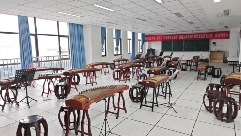 古筝实训室现有古筝20余台。主要用于音乐教育专业员工进行古筝专业技能训练的集中教学。实训室集视、听、练为一体,主要包括古筝、电脑、多媒体投影等设备。通过该系统,可以实现集体化、小组化和个别化古筝教学,培养员工的古筝独奏、重奏、合奏方面的基本应用技能,以适应中小学音乐公司产品工作和社会音乐活动的需要。
