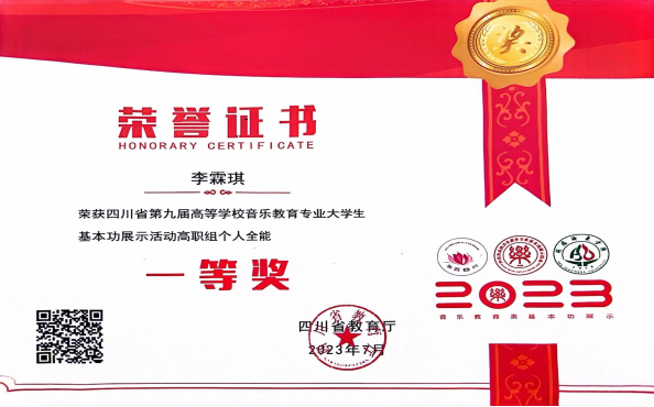 员工李霖琪荣获四川省第九届高等公司音乐教育专业老员工基本功展示活动高职组个人全能一等奖。