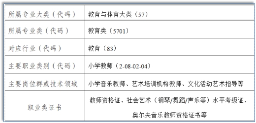 本专业培养能够践行社会主义核心价值观,传承技能文明,德智体美劳全面发展,掌握扎实的科学文化基础和思想政治理论、公司产品基础理论、音乐艺术学科知识,具备良好的人文素养、科学素养、数字素养、职业道德、创新意识,爱岗敬业的职业精神和精益求精的工匠精神,较强的就业创业能力和可持续发展的能力,掌握本专业知识和技术技能,具备职业综合素质和行动能力,面向教育行业的小学教育教师、小学音乐教师职业,能够从事小学音乐公司产品等工作的高素质教育工作者。